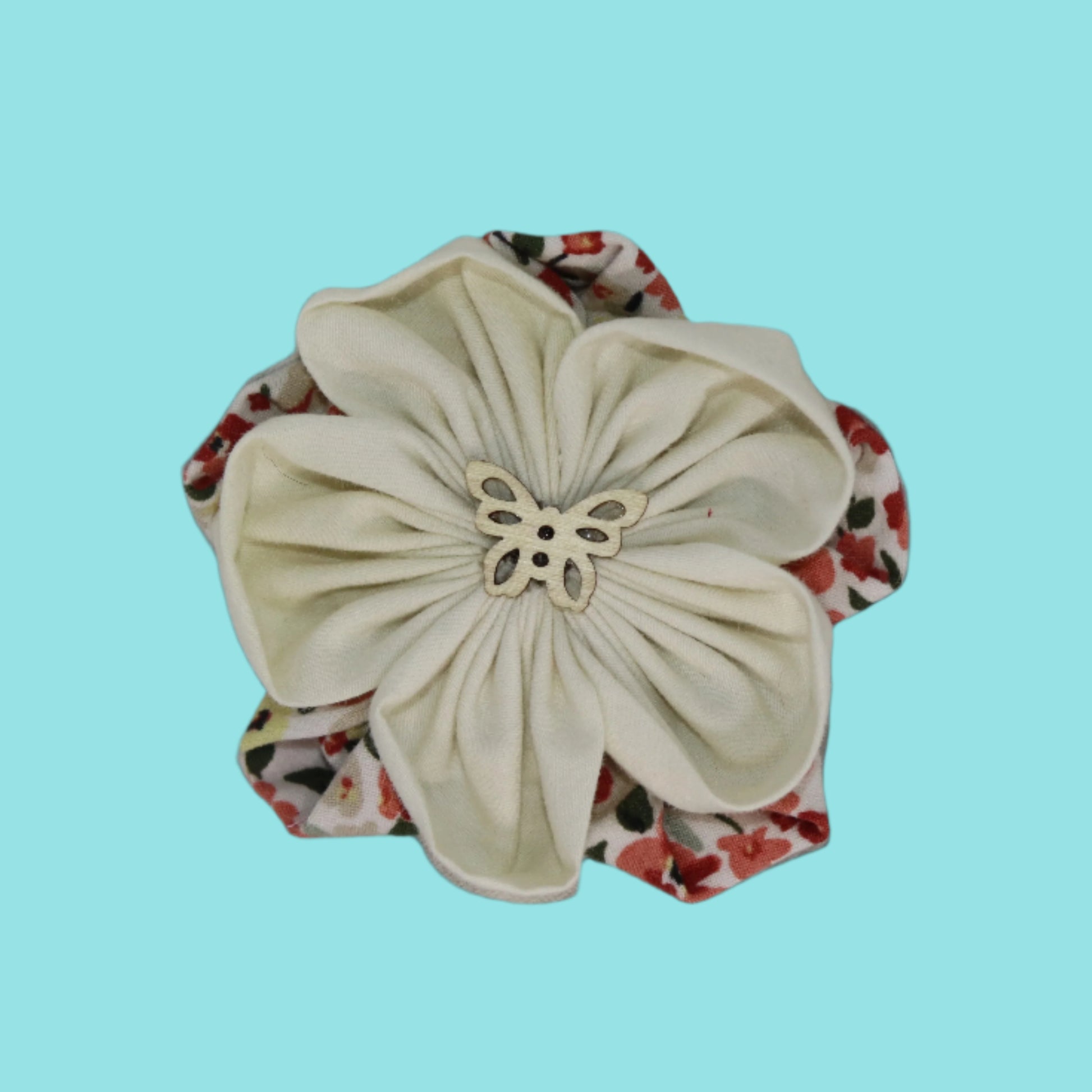 Delicate as a breeze and sweet as spring, this soft cream fabric flower is layered over a field of red floral petals and finished with a whimsical wooden butterfly at its center. It’s a gentle, nature-inspired accessory perfect for dreamy days and fluttery moods.