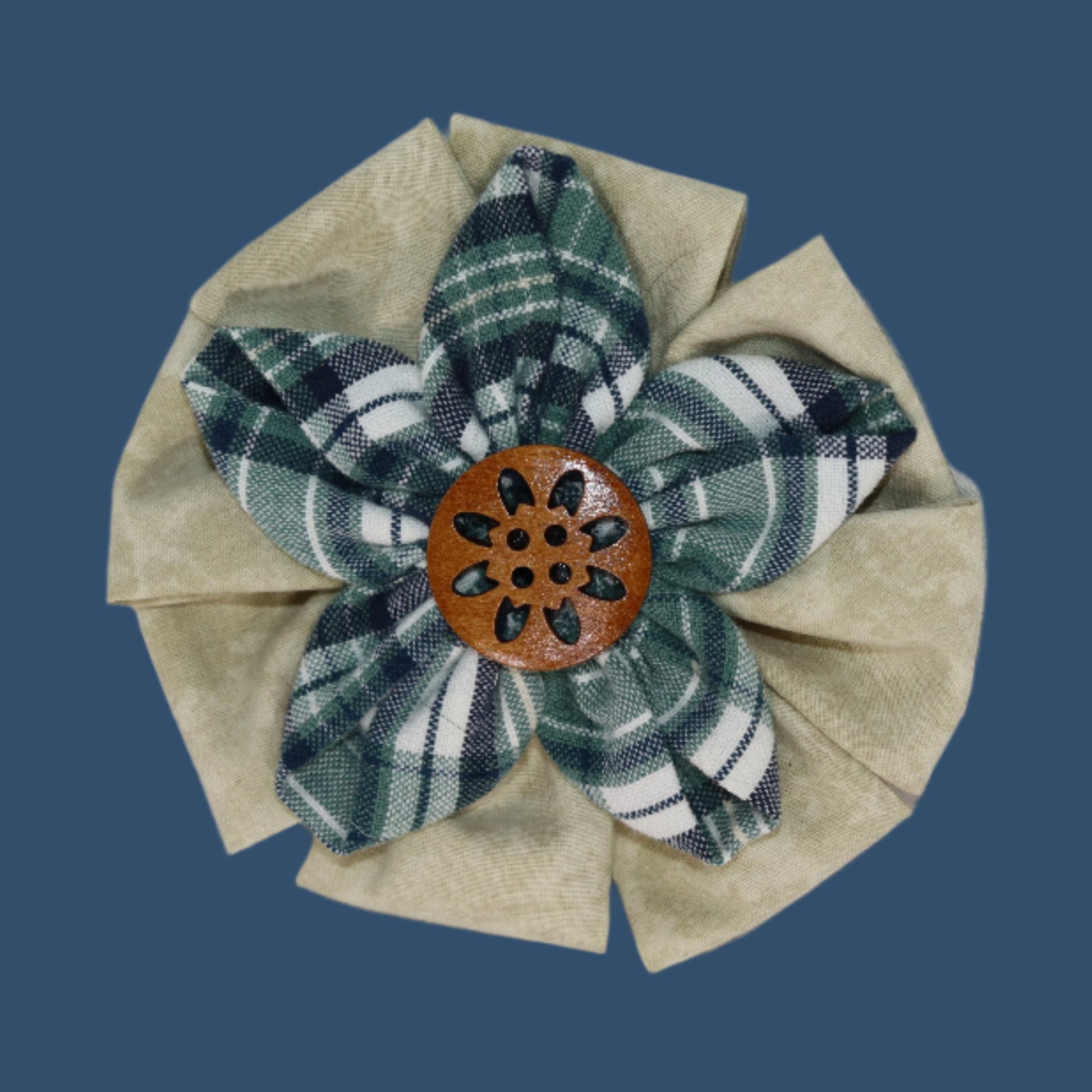 Bringing forest charm to any outfit, this handcrafted bloom features layers of soft taupe petals and deep green plaid that feels straight from a cozy woodland stroll. A carved wooden button sits at the center like a tiny treasure from the forest floor—natural, unique, and full of personality.